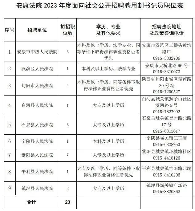 全市法院共招聘聘用制書記員23名,各法院招聘職位、地址及政策咨詢電話詳見《安康法院2023年面向社會公開招聘聘用制書記員職位表》(附件)。
